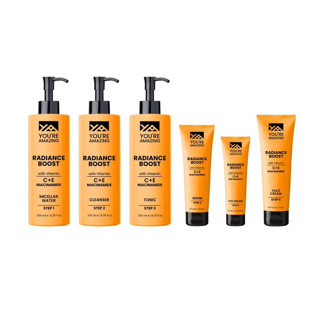 Vitamin-Infused Radiance Boosters Skincare Line ir pilna sejas kopšanas sistēma pret ādas fotonovecošanos, kas attīra, baro un atjauno ādu. Šī produktu līnija nav paredzēta tikai ādas kopšanai – tā pārliecinoši mainīs jūsu ikdienas rūpes par ādu. Šī novatoriskā produktu līnija, kuras pamatā izmantots C, E vitamīna un niacinamīda trio transformējošais spēks, sniedz mērķtiecīgus risinājumus ādas toņa uzlabošanai un izlīdzināšanai, kā arī ādas sausuma un priekšlaicīgas novecošanas novēršanai. Ikviens produkts ir rūpīgi izstrādāts, lai nodrošinātu harmonisku iedarbību un visaptverošu pieeju ādas kopšanai, padarot jūsu ādu mirdzošu, mitrinātu un acīmredzami veselīgāku. Vitamin-Infused Radiance Boosters produkti ne tikai kopj jūsu ādu, bet pārvērš to.